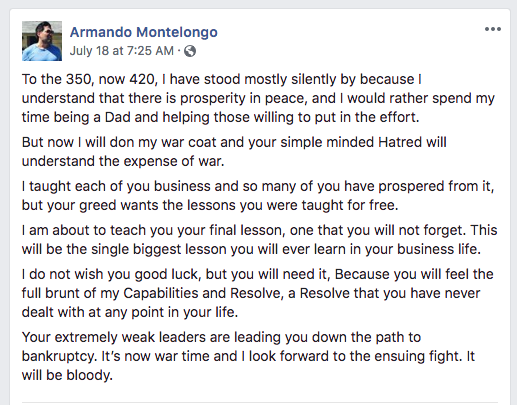 “To hide their deception, Montelongo and his employees instill fear in the students to discourage them from questioning the AMS system, and attack or silence those who attempt to speak out. For example, early on in a group event, when someone asks a question, Montelongo will berate the speaker, deriding him or her for wasting the other students’ time. Cowed, few others will dare to interrupt again. At other points in an event, Montelongo will mention his in-house legal team, and claim that no one could possibly sue him and win. The crux of these remarks is that anyone who would cross Montelongo on a business deal would lose, and that any student who would cross him would lose, too.”